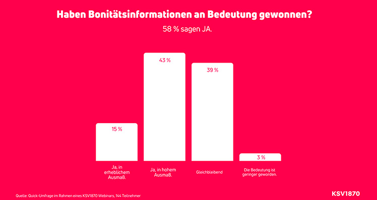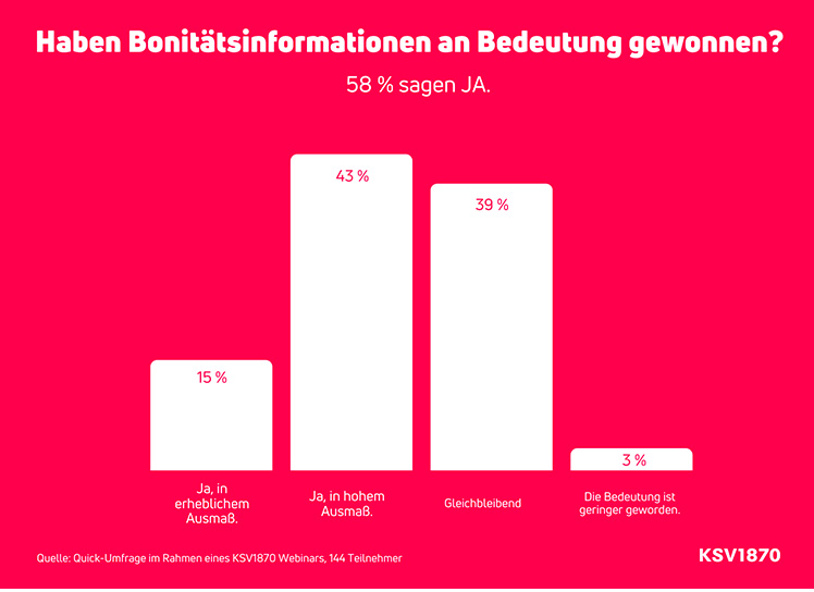 Der Großteil wehrt sich und ergreift Maßnahmen, um die wirtschaftlichen Risiken möglichst gering zu halten. Im Rahmen eines KSV1870 Webinars wurden vor Kurzem rund 150 Teilnehmer gefragt, ob Bonitätsinformationen zuletzt an Bedeutung gewonnen haben. Das Ergebnis: Fast 60 Prozent haben dies bejaht. "Positiv daran ist, dass die Unternehmen in den Werkzeugkoffer der guten Unternehmensführung greifen, um Risiken zu reduzieren und sich abzusichern", so Fasching.