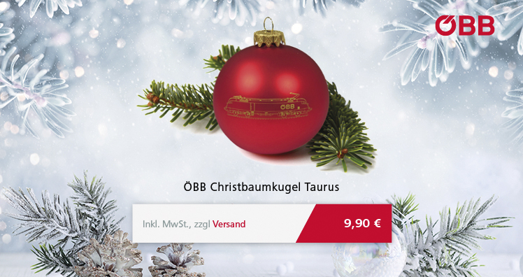 Unser Tipp: Passende Geschenke und Produkte für Weihnachten bestellen Sie am besten rechtzeitig bis 19. Dezember. Schmücken Sie zum Beispiel Ihren Christbaum mit unserer schönen ÖBB Christbaumkugel im Taurus-Design!