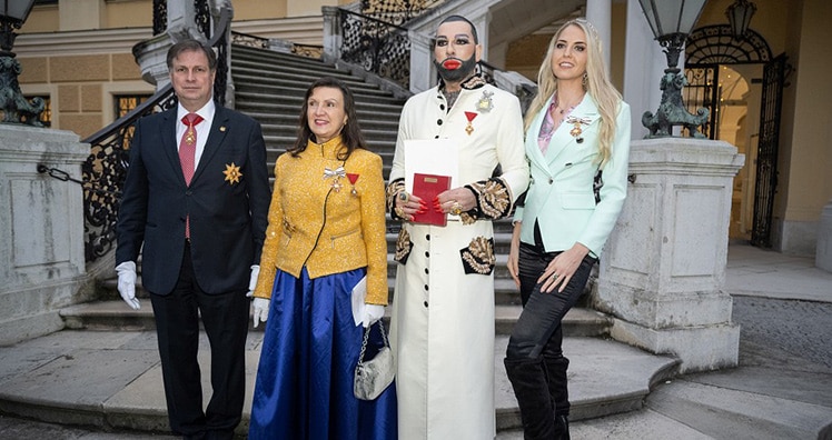 Dort wurde dem schrillen Designer von Sandor Habsburg-Lothringen der Franz-Joseph-Orden für seinen Einsatz für Menschen am Rande der Gesellschaft verliehen. Unter anderem wohnten Miss Europe Beatrice Turin und ihr Ehemann Heimo der Verleihung bei.