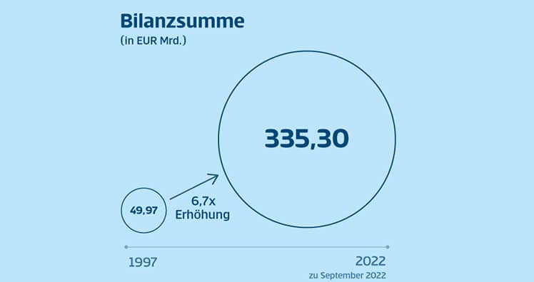 Seit der Erstnotiz an der Wiener Börse vor einem Vierteljahrhundert hat sich die Bilanzsumme der Erste Group fast versiebenfacht und lag mit Ende September 2022 bei über 335 Milliarden Euro. Auch die Marktkapitalisierung der Bankengruppe ist ebenfalls stark gewachsen: von umgerechnet 2,03 Milliarden Euro Ende 1997 auf über 12,72 Milliarden Euro per 30. November 2022. Die Zahl der Mitarbeiter:innen der Erste hat sich in den letzten 25 Jahren fast verfünffacht, der Anteil der Beschäftigten außerhalb Österreichs ist in diesem Zeitraum von 17 Prozent auf 65 Prozent gestiegen.