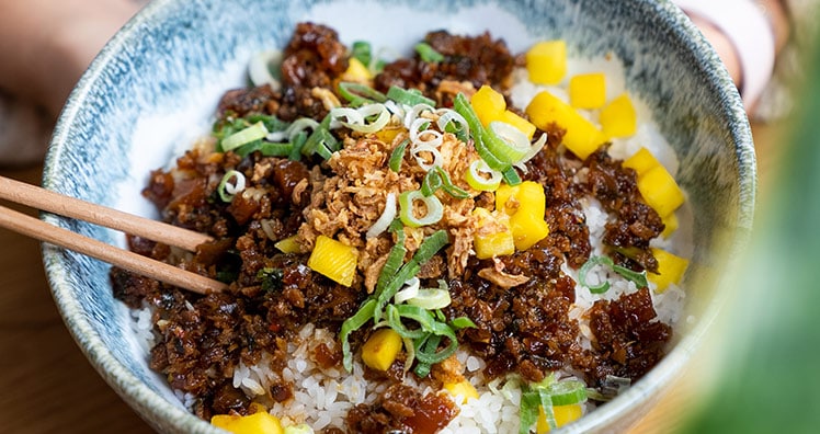 Seit Anfang November gehöre die warme, asiatisch angehauchte Signature Bowl "Vegan Bowlonasia Monk" zu den Favoriten der Gäste, heißt es von Seiten der Restaurantkette. Gefüllt ist die Bowl mit Reis, veganer Bolognese aus Erbsenprotein, Jungzwiebeln, Mango-Salsa und Röstzwiebeln.