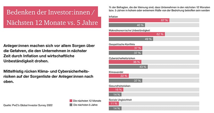 Weltweit stufen Investor:innen die Inflation (67 Prozent), wirtschaftliche Volatilität (62 Prozent) und geopolitischen Konflikt (37 Prozent) als die größten Gefahren für Unternehmen in den kommenden zwölf Monaten ein. Direkt danach folgen Cybersecurity-Risiken (36 Prozent) und der Klimawandel (22 Prozten). Das zeigen die Ergebnisse der Global Investors Survey 2022 von PwC.