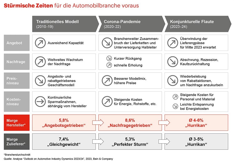 Bereits seit zwei Jahren haben die Zulieferer mit einer rückläufigen Profitabilität zu kämpfen. In den ersten drei Quartalen 2022 sank ihre durchschnittliche EBIT-Marge auf nur noch rund 4,5 Prozent. Dabei hatte diese bis zum Ausbruch der Corona-Pandemie mit fünf bis acht Prozent immer ein bis zwei Prozentpunkte über der Marge der Hersteller gelegen. Einzige Ausnahme waren die Finanzkrisenjahre 2008 und 2009 gewesen.