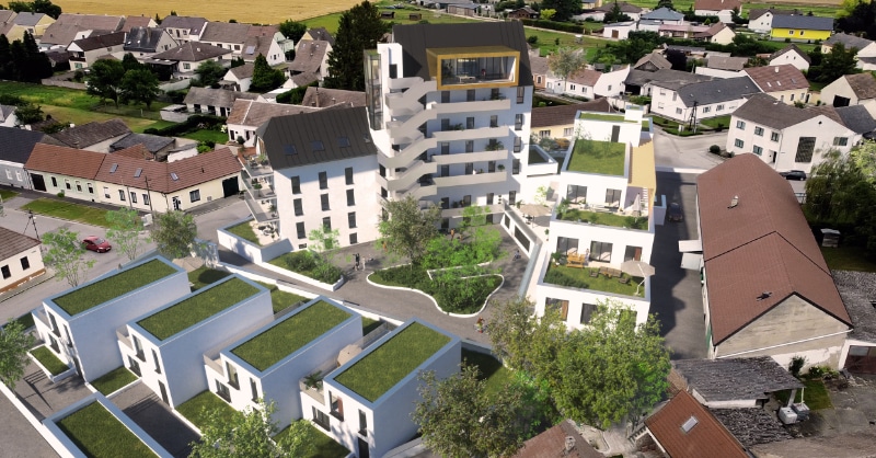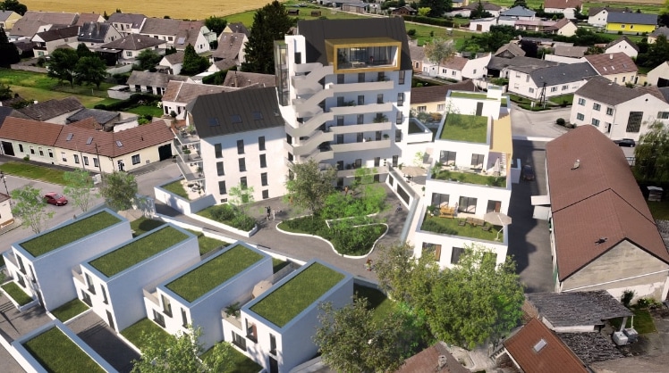 Das ehemalige Lagerhaus der Marktgemeinde Bernhardsthal soll nun zu einem modernen Wohnraum umgebaut werden. Insgesamt sollen direkt im Ortszentrum 24 Wohnungen, ergänzt durch vier Reihenhäuser mit begrünten Flachdächern sowie zusätzliche Gewerbeflächen und Büros entstehen.