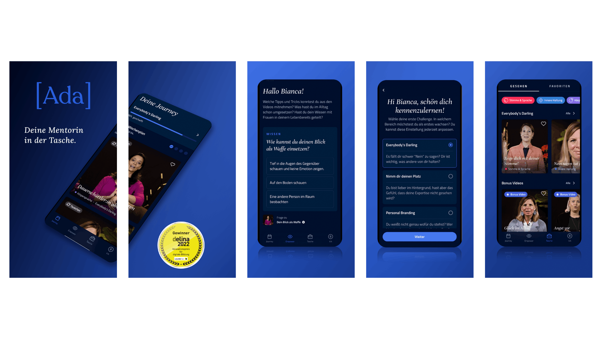 Kovar: Weibliche Talente gewinnen, binden und Potentiale entfalten: Mit täglichen, 2-minütigen Lernvideos von namhaften Expertinnen fungiert die Ada App wie eine "Mentorin in der Tasche" für Mitarbeiter:innen. Die Nutzer:innen bekommen über die App Zugang zu zweiminütigen Videos von etwa Katrin Stuflesser (Stimme & Sprache), Anke van Beekhuis (innere Haltung), Yvonne de Bark (Körpersprache) und Jessica Lackner (Kommunikation & Rhetorik) und weiteren Expert:innen, die als Role Models fungieren. Die App ist dabei eine B2B-Lösung: Unsere Zielgruppe sind Unternehmen, die die Nutzung der App ihren Mitarbeiter:innen im Rahmen von Weiterbildungsoptionen ermöglichen.