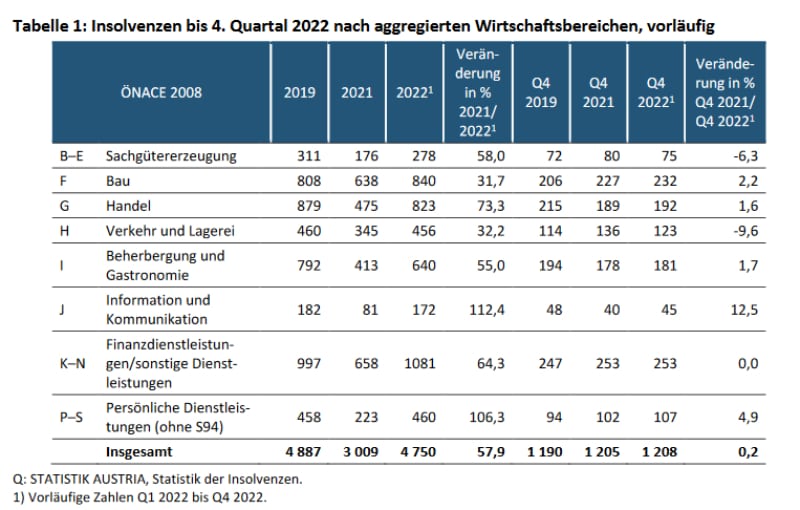 Insolvenzen bis 4. Quartal 2022 nach aggregierten Wirtschaftsbereichen: Vorläufige Zahlen © Statistik Austria