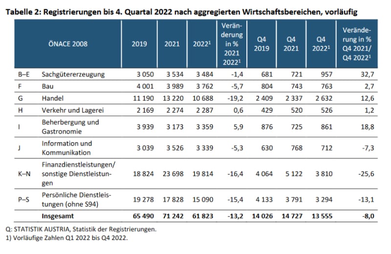 Registrierungen bis 4. Quartal 2022 nach aggregierten Wirtschaftsbereichen: Vorläufige Zahlen © Statistik Austria