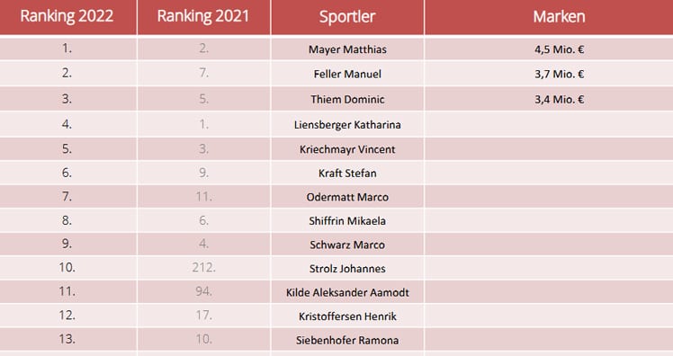 Dass in Österreich nicht König Fußball, sondern Kaiser Skifahren regiert, wird beim Blick auf die einzelnen Werbewerte der Athlet:innen deutlich. Werbespitzenreiter war nämlich Ex-Skirennläufer Matthias Mayer, der für seine Sponsoren einen Werbewert von 4,5 Millionen Euro generierte. An zweiter Stelle landete der Slalom-Spezialist Manuel Feller mit 3,7 Millionen Euro. Auf Platz drei schaffte es Tennis-Ass Dominic Thiem. Gleich acht Skifahrer:innen sind in den Top zehn vertreten.