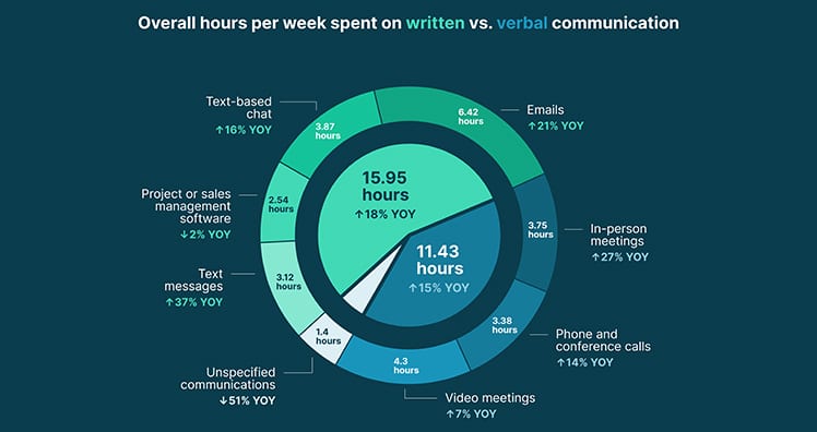 Die gesammelten Ergebnisse würden verdeutlichen, dass sich die Auswirkungen schlechter Kommunikation auf Produktivität, Stress, Selbstvertrauen und Arbeitszufriedenheit verstärken. Im Vergleich zum Vorjahr verbrachten Mitarbeitende demnach 18 Prozent mehr Zeit mit schriftlicher Kommunikation. Führungskräfte berichten jedoch, dass die Effektivität der schriftlichen Kommunikation im gleichen Zeitraum um 12 Prozent gesunken ist.