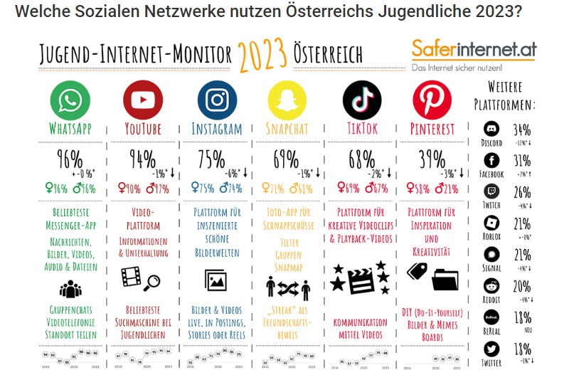 Social-Media-Plattformen stehen bei Jugendlichen weiter hoch im Kurs. Allerdings nicht mehr ganz so stark wie in Zeiten von Lockdowns und Distance-Learning. Saferinternet.at hat mit Unterstützung des Bundeskanzleramtes wie jedes Jahr die Social-Media-Favoriten von jungen Österreicher:innen ermittelt. Am Donnerstag wurden die Ergebnisse des "Jugend-Internet-Monitor 2023" veröffentlicht.