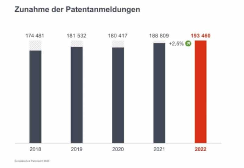 Im vergangenen Jahr gingen beim EPA 193.460 Anmeldungen ein. Dies entspricht einem Anstieg um 2,5 Prozent gegenüber 2021. Die Zahl der Patentanmeldungen belegt, dass die Innovationstätigkeit trotz weltweiter wirtschaftlicher Unsicherheiten 2022 robust geblieben ist.