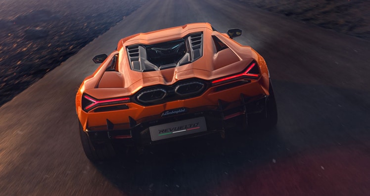 Konkret wird der Revuelto von einem V12-Saugmittelmotor mit 6,5 Litern Hubraum angetrieben, dem drei Elektromotoren zur Seite stehen, von denen einer in das neue Achtgang-Doppelkupplungsgetriebe integriert ist. Das Getriebe liegt erstmals in Querlage hinter dem längs eingebauten Verbrenner. Im seit Countach-Zeiten verwendeten Getriebetunnel sitzt statt einer Kardanwelle der Lithium-Ionen-Akku. Während der V12 die Hinterräder antreibt, sorgen an der Vorderachse erstmalig zwei Elektromotorenn - je einer pro Rad – für Vortrieb und einen elektrischen Allradantrieb (inklusive Torque Vectoring). Der V12 gibt 725 Newtonmeter und die drei Elektromotoren geben je 350 Newtonmeter ab. Die kombinierte Leistung des gesamten Antriebsstrangs beträgt 1.015 PS. Die Fahrleistungen fallen dementsprechend beeindruckend aus: Von 0 auf 100 km/h beschleunigt der Supersportler in 2,5 Sekunden und seine Höchstgeschwindigkeit liegt laut Lamborghini bei über 350 km/h.