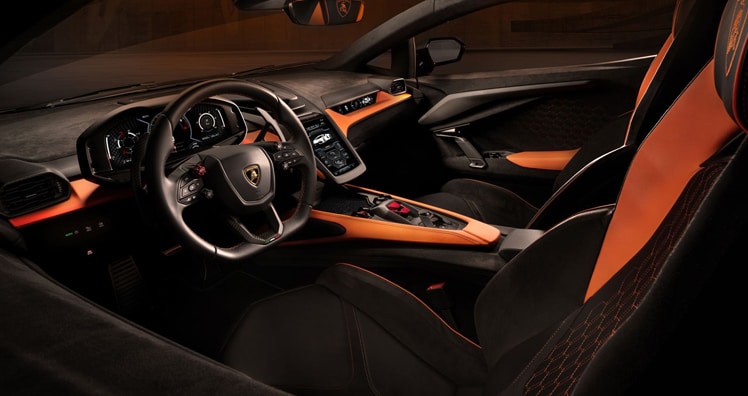 Im Cockpit hat nun auch bei Lamborghini die Digitalisierung voll durchgeschlagen. Die meisten der verbliebenen mechanischen Tasten befinden sich am Lenkrad und auf der Mittelkonsole. Dort findet sich auch der unter einer roten Klappe versteckte Startknopf. Ansonsten dominieren die Monitore. Während der Fahrer Infos auf dem 12,3 Zoll großen digitalen Kombiinstrument erhält, werden die Daten für den Beifahrer simultan auf einem 9,1 Zoll großen Bildschirm vor ihm dargestellt. Dazwischen ist ein 8,4 Zoll großer Touchscreen angesiedelt. Dank Swipe-Unterstützung können Fahrer und Beifahrer Apps und Informationen vom zentralen Bildschirm wie am Smartphone nach links und rechts schieben. Vier Drehschalter an den Speichen des Lenkrads ermöglichen die Wahl der Fahrmodi, die Höhenverstellung des Fahrwerks und die Neigung des Heckspoilers.