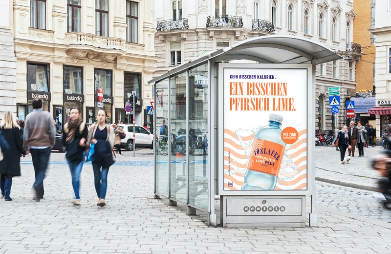 Die neue Kampagne ist ab Mitte April auf Citylights, Digiscreens am POS und online zu sehen und soll vor allem durch ihren reduzierten Stil bestechen. Die Sujets seien ganz auf einer Wellenlänge mit einem aktuellen Consumer:Trend: "Mineralwasser plus Geschmack, ohne Kalorien und mit extra Benefits". Auch das Packaging wurde von der Agentur übernommen. Etiketten, Trayfolien und Tragegriffe leuchten in Grün und Orange.