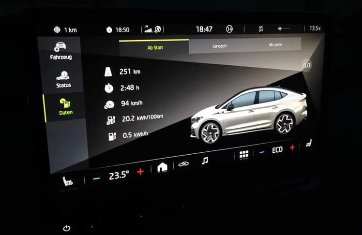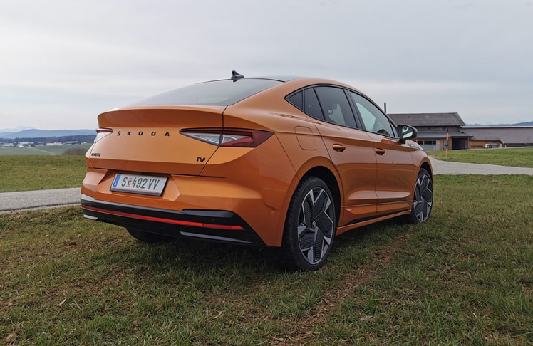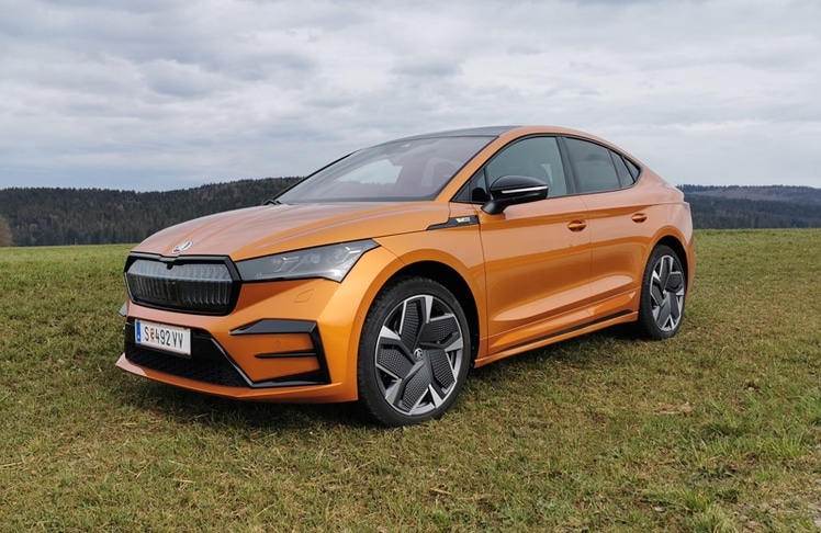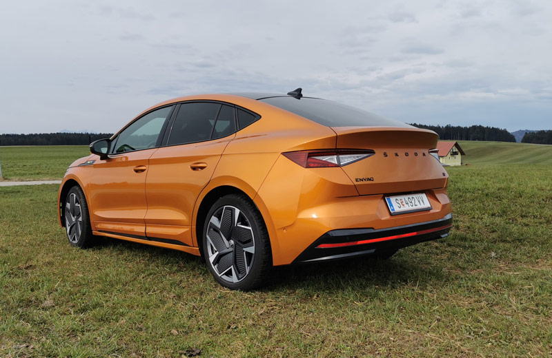 Im Test haben wir diesen Wert nicht ganz erreicht. Eine Fahrt von Wien nach Salzburg ohne nachladen, wobei der Tempomat auf der Autobahn auf 130 km/h eingestellt war, hat es aber gereicht. Bevor es zurück nach Wien ging, haben wir das Enyaq Coupé RS auch Überland und im Stadtgebiet bewegt. Insgesamt kamen wir auf einen Verbrauch von 20,2 kW auf 100 km gekommen, was angesichts von Größe (2,65 m lang), Gewicht (rund 2,35 Tonnen) und Leistung ein wirklich guter Wert ist. Wenn man die volle Performance ständig abruft und auf der Autobahn schneller fährt, oder es starke Minusgrade hat, ist der Akku natürlich deutlich rascher leer. Wir haben das Fahrzeug im Test jedoch so bewegt, wie ein "normales" Auto. Und da liegt die realistische Reichweite bei 380 bis 400 Kilometer. Was beim effizienten Fahren hilft ist die sehr gut abgestimmte Rekuperation, deren Stärke man über die Lenkradpaddles beeinflussen kann. Das ist aber nicht notwendig, denn die automatische Einstellung, die Navi-, GPS- und Sensordaten nutzt, funktioniert derart souverän, das es ab und an fast gespenstisch wirkt. So wird die Geschwindigkeit vor Ortseinfahrten, Kreisverkehren oder vorausfahrenden Autos stets nahezu perfekt und äußerst harmonisch reduziert. Die dabei zurückgewonne Energie (Rekuperation) fließt wieder in den Akku zurück.