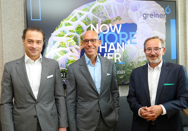 Bei der Jahres-Pressekonferenz präsentierte die Führungsspitze der Greiner AG, Axel Kühner, Vorstandsvorsitzender der Greiner AG, Hannes Moser, Finanzvorstand der Greiner AG und Manfred Stanek, Chief Operating Officer der Greiner AG, den Geschäftsbericht 2022.