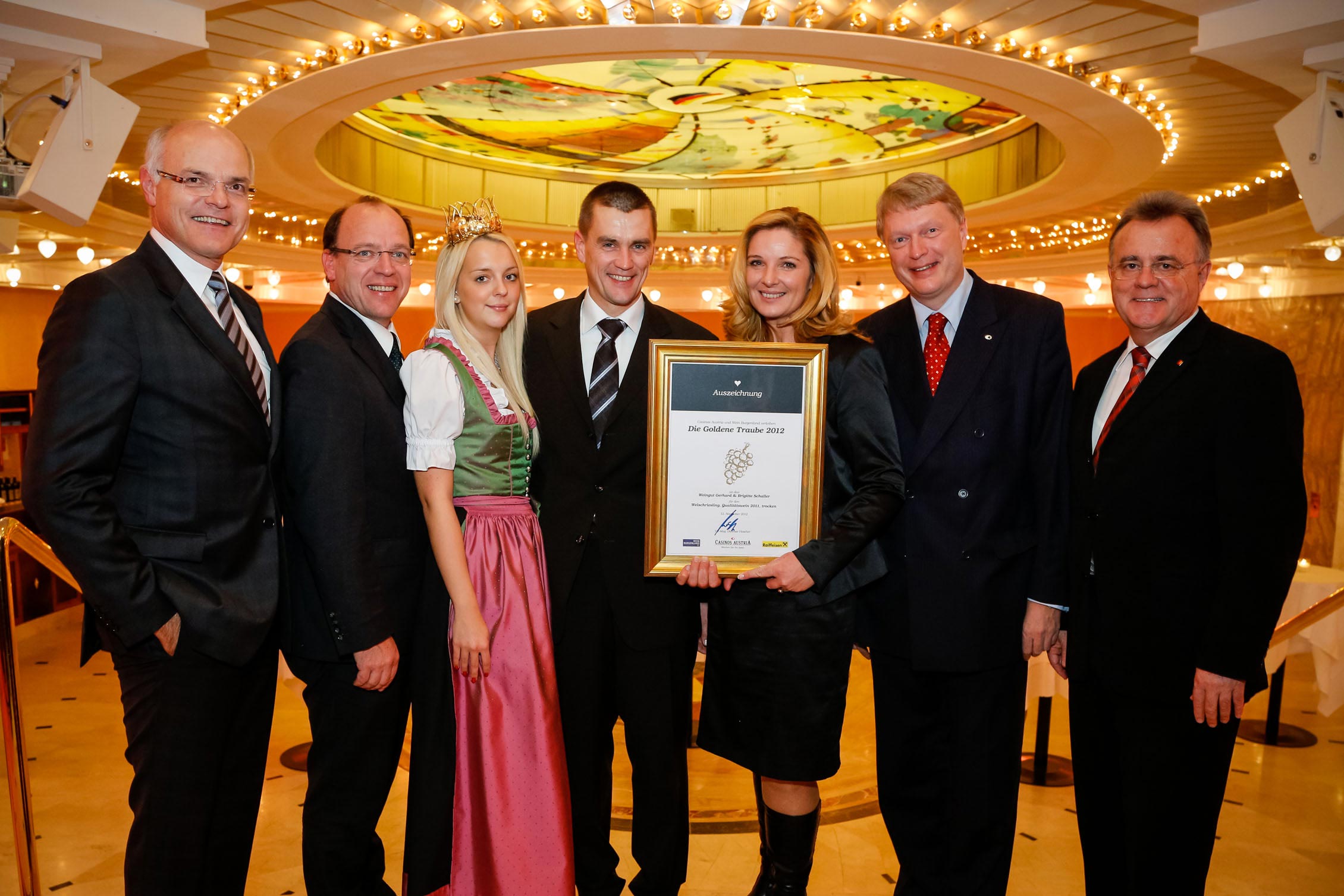 Seit mehr als einem Vierteljahrhundert wird die wichtigste Auszeichnung um den burgenländischen Wein – die Goldene Traube – von Casinos Austria gemeinsam mit Wein Burgenland für herausragende Weine verliehen. Heuer fand die Prämierung erstmals im Casino Baden statt. In der Laudatio auf den Preisträger konnte Casinos Austria Vorstand Dietmar Hoscher auch mit launigen Auszügen aus dem Leben des Winzerehepaares aufwarten. So auch damit, dass es der Winzer Gerhard Schaller geschafft hat, dass seine Frau aus dem Kärntner Brau-Ort Hirt dem Bier entsagt und dem Ruf des Weines nach Podersdorf ins Burgenland folgte. Der Siegerwein der Goldenen Traube wird jedes Jahr im Rahmen der burgenländischen Landesprämierung eruiert.
