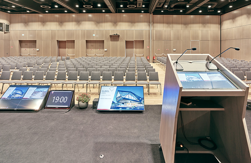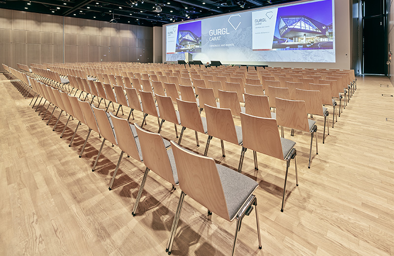 20 m Länge und 5 m Höhe, das sind die Maße der Frontleinwand im größten Saal Schlafkogel. Die 100 m2 große Leinwand wird mit drei leistungsstarken Full-HD-Beamern bespielt. Dank Edge Blending sind zusammenhängende Bilder auf der gesamten Länge möglich – ideal für spektakuläre Präsentationen, Imagefilme oder Produktvorführungen. Auch Ton und Licht sind im Gurgl Carat auf höchstem Niveau. Das qualitative Soundsystem L-Acoustics garantiert Videoshows mit Kinoatmosphäre, die facettenreiche Lichttechnik lässt sich für jede Veranstaltung individuell adaptieren.