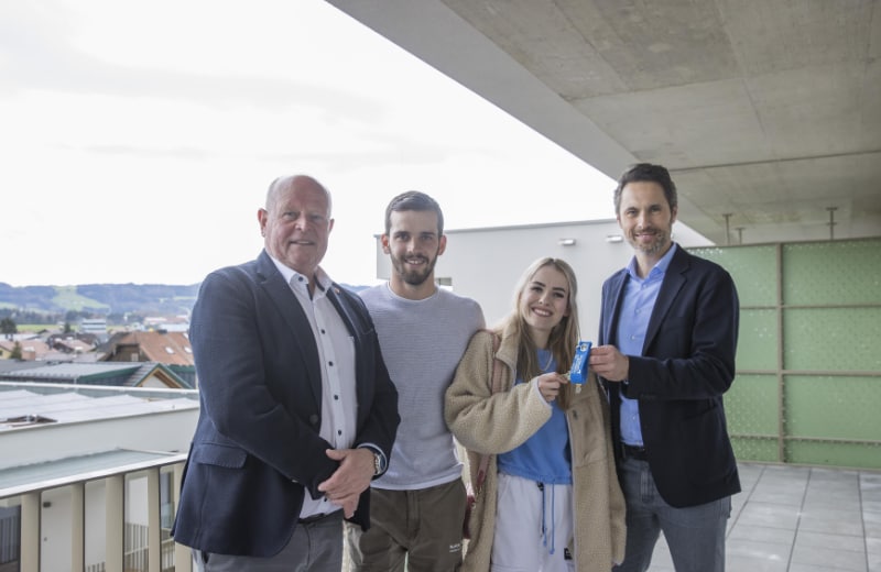 V.l.n.r.: Konrad Pieringer, Bürgermeister von Seekirchen, Manuel und Katharina Reuder, neue Bewohner:innen und Georg Grundbichler, Geschäftsführer der Salzburg Wohnbau, bei der Schlüsselübergabe © Neumayr Fotografie