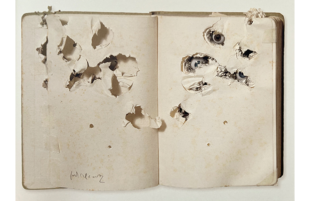 Ideen, die aus dem Nichts durch in Plexiglas verteilte Löcher auftauchen, als würden sie herauskommen und atmen wollen. Bewegungen des Windes der, in den von Alcaraz erhitzten und manipulierten Plexiglasflächen widerhallt. Seelen, die sich schwarz aus Büchern ergießen und unter Glas konserviert werden.