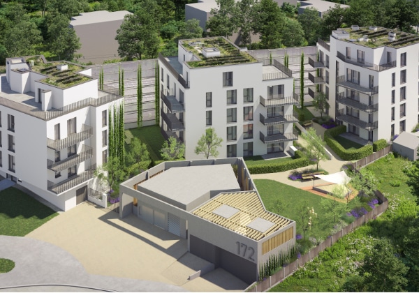 Auf der zweiten Liegenschaft in der Lainzer Straße 172 entstehen drei freistehende Stadtvillen mit 41 Eigentumswohnungen. Auf jeweils vier Geschossen werden hier Zwei- bis Vierzimmerwohnungen in den Größen von 49 bis 117 Quadratmeter mit ebenfalls Freibereichen wie Garten, Terrasse oder Balkon umgesetzt.