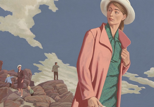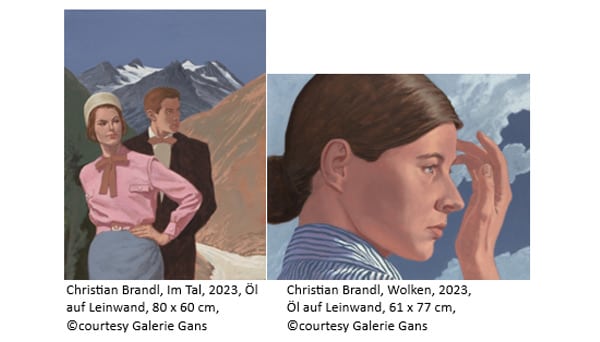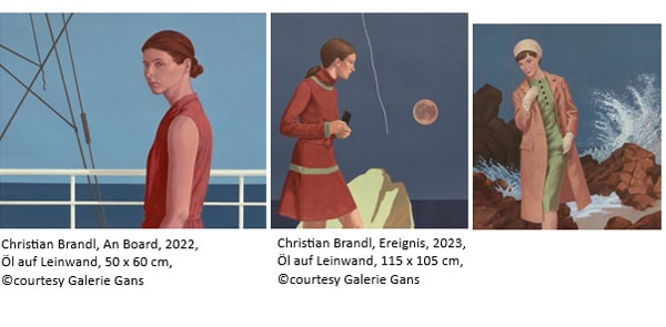 Modisch versetzt der Künstler sein stets gepflegtes, in der bürgerlichen Oberschicht zu verortendes Personal in die 50er und 60er Jahre und inszeniert so eine Retrospektive, die aber anhand von Details wie Mobiltelefonen auch immer wieder in die Gegenwart verweist. Nicht wenige Arbeiten Christian Brandls lassen einen in ihrer gleichzeitig ruhigen wie spannungsgeladenen Momenthaftigkeit und den eleganten Protagonisten an Fotos aus Modejournalen und Filmstils aus den Glanzzeiten Hollywoods denken, Hitchcock schießt einem in den Kopf.