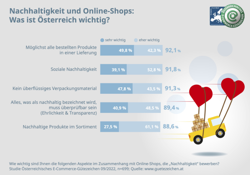 Laut einer Studie des Österreichischen E-Commerce-Gütezeichens bestellen inzwischen 86 Prozent der Befragten zumindest einmal im Monat aus dem Internet. Dabei gewinnt das Thema Nachhaltigkeit neben der Vertrauenswürdigkeit und Benutzerfreundlichkeit der Shopping-Website immer mehr an Bedeutung.