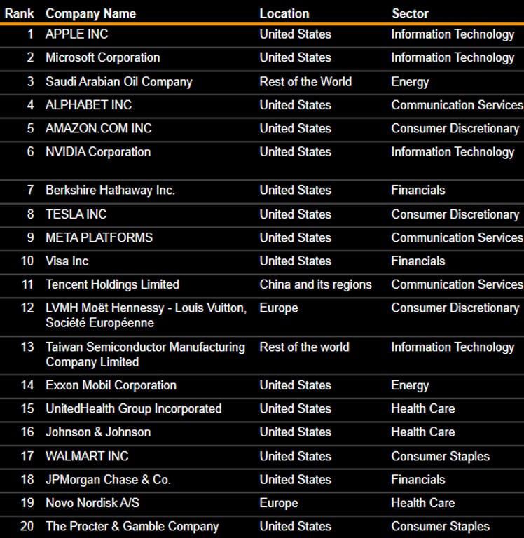 Wie im Vorjahr sind mit Apple und Microsoft zwei US-Technologiekonzerne (Platz 1: 2,61 Billionen Dollar; Platz 2: 2,15 Billionen Dollar) an der Spitze des Rankings, gefolgt vom Energie-Unternehmen Saudi Aramco mit Sitz in Saudi-Arabien (Platz 3: 1,89 Billionen Dollar). Auf Platz 4 und 5 stehen mit Alphabet (Google, etc.) und Amazon dieselben Unternehmen wie im Vorjahr mit 1,33 Billionen Dollar bzw. 1,06 Billionen Dollar Marktkapitalisierung. Allerdings würden sich die Top-Performer PwC zufolge zum ersten Mal seit zehn Jahren mit einem Rückgang ihrer Marktkapitalisierung konfrontiert sehen.