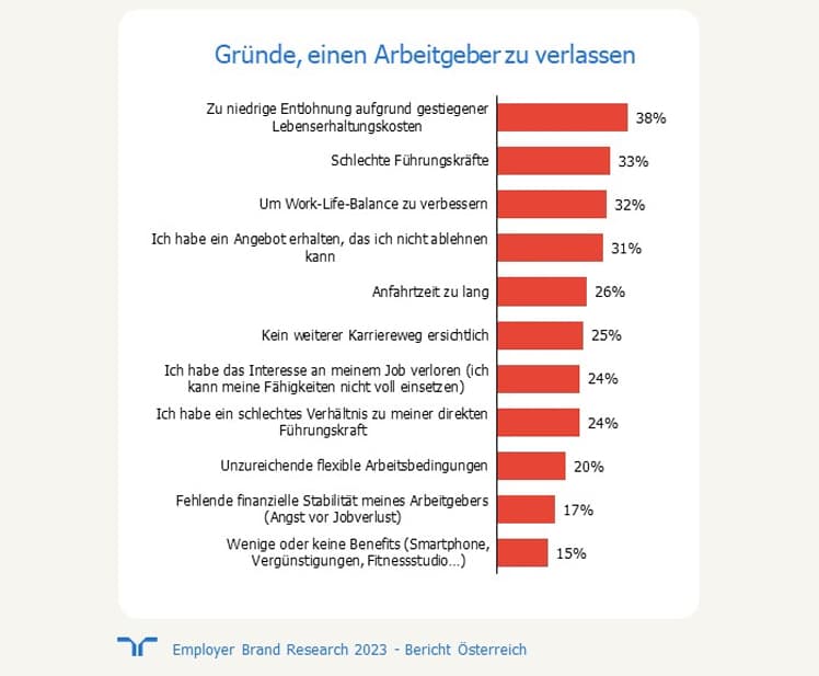 In dieser Situation würden sich die Österreicher:innen durchaus wechselwillig zeigen: Der Studie zufolge plant jede:r Fünfte (19 Prozent), in den kommenden sechs Monaten den Arbeitgeber zu wechseln. Bei den 18- bis 24-Jährigen erwäge dies sogar jede:r Vierte (26 Prozent). Vor allem die Inflation würde sich stark auf die Mitarbeiter:innen-Bindung auswirken. Eine – gemessen an den steigenden Lebenshaltungskosten – zu niedrige Vergütung stellt derzeit für 38 Prozent der Beschäftigten den Hauptgrund dar, abzuwandern. Für die 25- bis 34-Jährigen ist dies sogar noch wichtiger, da 44 Prozent von ihnen angeben, dass sie einen Arbeitgeber aus diesem Grund verlassen würden oder bereits verlassen haben. Schlechte Führungskräfte (33 Prozent) und die Verbesserung der Work-Life-Balance (32 Prozent) seien ebenfalls wesentliche Gründe für einen Austritt.