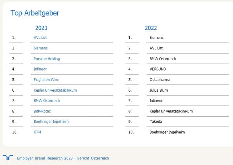 "Jede der Top-5-Arbeitgebermarken AVL List, Siemens, Porsche Holding, Infineon und Flughafen Wien gilt in der allgemeinen Wahrnehmung der Österreicher:innen als finanziell gesund, genießt einen sehr guten Ruf und verspricht Arbeitsplatzsicherheit. Dies zeigt, wie wichtig diese Faktoren für eine starke Arbeitgebermarke sind", so Toonen abschließend.