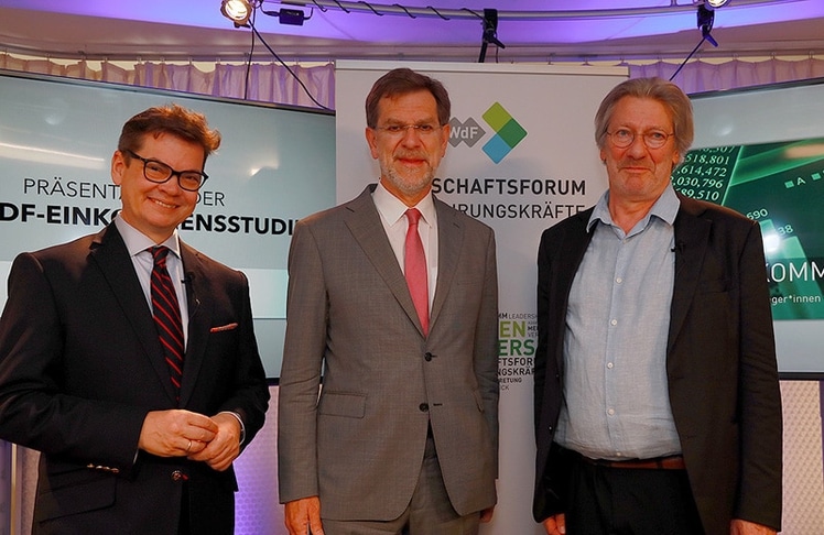 Das Wirtschaftsforum der Führungskräfte (WdF) hat am Mittwoch seine aktuelle Einkommensstudie präsentiert. Für die Erstellung der mittlerweile 42. Ausgabe wurden die Angaben von 459 Führungskräften aus der ersten und zweiten Führungsebene durch das Marktforschungsinstitut Triconsult gesammelt und ausgewertet. Präsentiert wurden die Ergebnisse von Andreas Zakostelsky, WdF-Bundesvorsitzender, Christoph Neumayer, Generalsekretär Industriellenvereinigung und Felix Josef, Geschäftsführer Triconsult.