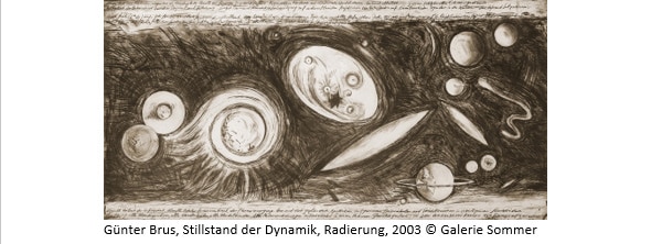 Obgleich es von Nitsch bereits Beispielhaftes aus den 1950er-Jahren gibt, bedingt durch seine Ausbildung an der Graphischen Lehr- und Versuchsanstalt in Wien, setzen beide die Möglichkeiten der Druckgrafik erst ab den 1980er-Jahren konsequent in ihrem Schaffen ein. Brus, der Proponent einer „direkten Kunst“, arbeitet ohne Vorzeichnung unmittelbar mit Stichel, Griffel, Messer und was er sonst noch zur Verfügung hatte in die Druckplatten und bleibt dem visuellen Kanon seiner parallel entstehenden Zeichnungen und Bild-Dichtungen verpflichtet. Nitsch sieht in der Grafik eine Möglichkeit der Reproduktion seiner Architekturzeichnungen, die er ab Mitte der 1960er-Jahre für sein Orgien Mysterien Theater entwirft.