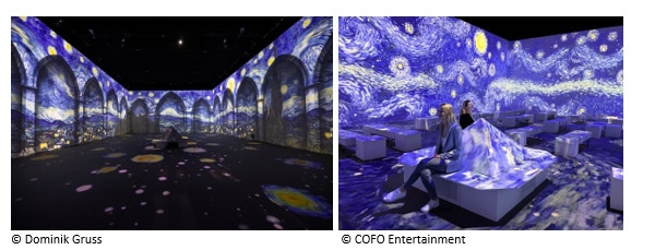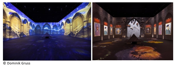 Die multimediale Lichtinstallation bringt die geballte Farbenpracht von Van Goghs Werken zur Geltung und macht Kunst für den Betrachter in einer immersiven Erfahrung greifbarer als je zuvor. In der einmaligen Inszenierung taucht der Besucher in die Werke Van Goghs ein und erlebt die virtuelle Illusion als Realität. Die Gemälde werden mit Hilfe von übergroßen Projektionen und Videoanimationen in Kombination mit gefühlvollen Melodien spürbar zum Leben erweckt. So bleibt dem Besucher kein Detail der berühmten Kunstwerke verborgen. Van Goghs Werke wie die weltberühmten „Sonnenblumen“, „Das Nachtcafé“, die „Sternennacht“, „Die Kartoffelesser“ oder das „Schlafzimmer in Arles“ werden aus einer ganz neuen Perspektive erlebbar. Der Betrachter befindet sich inmitten der Gemälde, er wird Teil der Szenerie, versinkt in Licht und Ton, die Kunstwerke interagieren mit ihm.