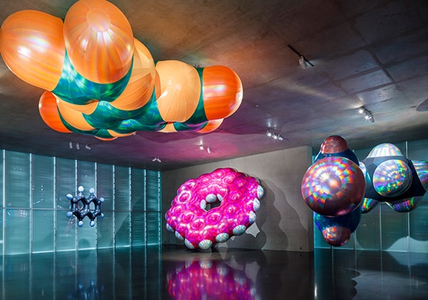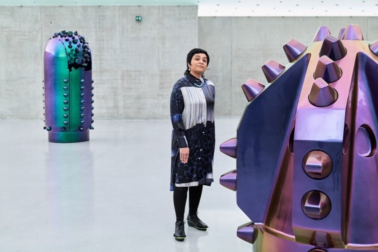 Monira Al Qadiri mit zwei ihrer Werke im Kunsthaus Bregenz © Miro Kuzmanovic / Kunsthaus Bregenz