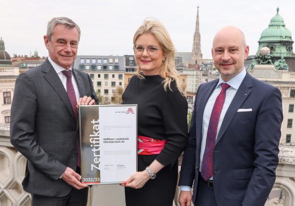 Anfang Mai 2023 überreichte Monica Rintersbacher, Leitbetriebe Austria Geschäftsführerin, das Zertifikat und beglückwünschte zur Auszeichnung: "Die Raiffeisenlandesbank Oberösterreich verfügt neben dem Bankgeschäft als Kerngeschäft über einen starken Beteiligungsbereich. Sie ist daher für viele Unternehmen, darunter große Leitbetriebe, ein langfristiger und verlässlicher Partner und Investor. Wir gratulieren zur Re-Zertifizierung als Leitbetrieb."