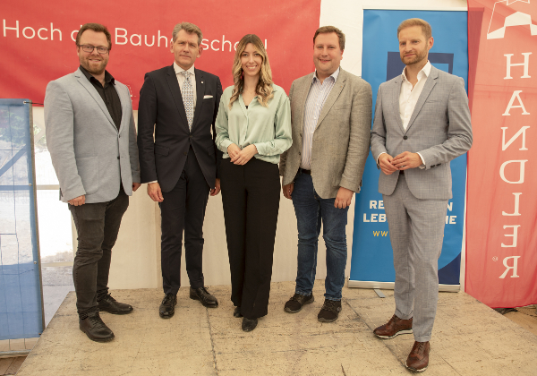 V.l.n.r.: Robert Pfisterer, Stadt Wr. Neustadt, Michael Neubauer, NID, Karina Schunker, EHL Wohnen, Christian Filipp, Stadt Wr. Neustadt, Michael Schranz, Handler Bau, bei der Gleichenfeier. © NOE Immobilien Development GmbH