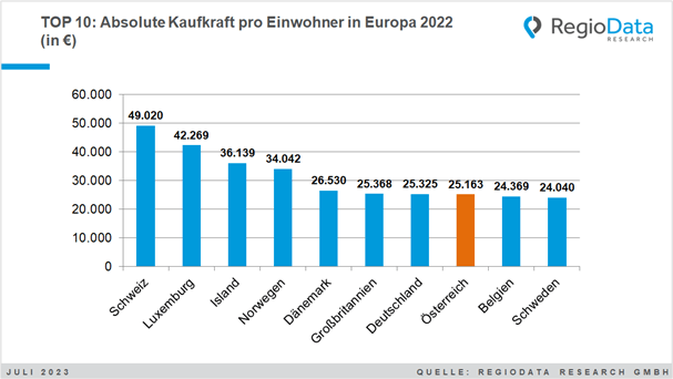 Die Unterschiede bei der Entwicklung der Kaufkraft auf internationaler Ebene zeigen, dass die wirtschaftliche Lage und die Möglichkeiten des Konsums in verschiedenen Ländern stark variieren. Während im Kosovo ein Einwohner nur ca. 2.400 Euro zur Verfügung hat, hat ein Schweizer 20 Mal so viel. Wie in den Vorjahren liegen die vier Länder mit der höchsten Kaufkraft in Europa für den Rest nahezu in unerreichbarer Ferne: Schweiz, Luxemburg, Island und Norwegen.