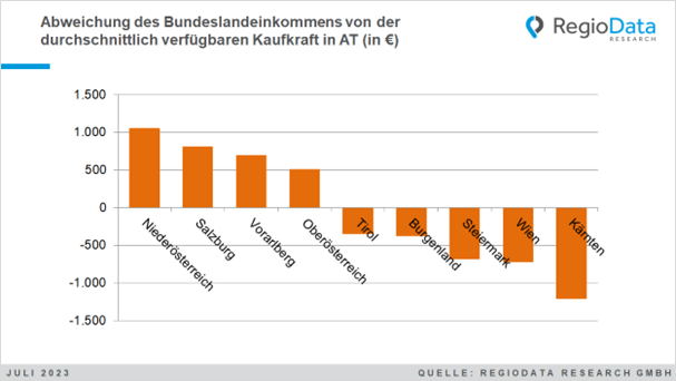 RegioData hat auch in diesem Jahr die absolute Kaufkraft in Österreichs Bundesländern analysiert. Hier hat sich in der Rangreihung nicht allzu viel verändert. Das kaufkraftstärkste Bundesland bleibt der Studie zufolge Niederösterreich mit einer absoluten Kaufkraft von 26.222 Euro pro Kopf im Jahr und profitiere so vom "Speckgürtel" rund um Wien. In den österreichischen Tourismushochburgen Tirol und Salzburg, aber auch abgeschwächt Wien, seien die Nachwirkungen der Corona-Krise zu merken: Die durchschnittliche Kaufkraft würde sich etwas weniger stark entwickeln als erwartet.