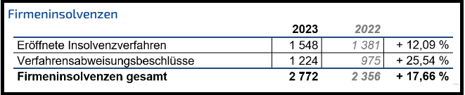 In der Corona-Pandemie wurde ein Rückstau an circa 2.000 Firmeninsolvenzen aufgebaut aber noch nicht abgebaut. Das Wiedererreichen des Niveaus von 2019 ist auf geänderte wirtschaftliche Rahmenbedingungen und neuartige Insolvenzursachen zurückzuführen.