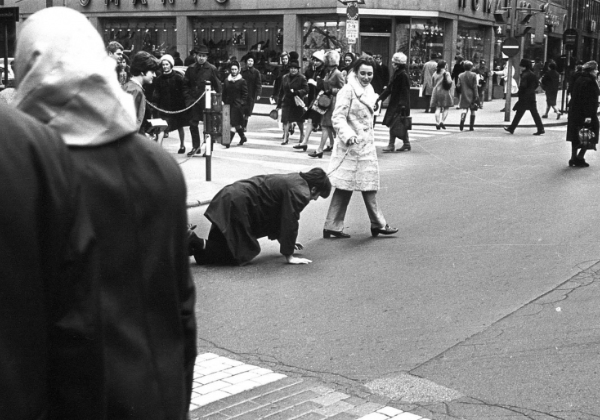 Im Februar 1968 führt VALIE EXPORT Peter Weibel an einer Hundeleine zunächst zu einer Vernissage in der Wiener Galerie St. Stephan, eine Woche später dann über die Kärntnerstrasse: "Aus der Mappe der Hundigkeit", © VALIE EXPORT, Bildrecht, Wien 2023, Foto: Joseph Tandl