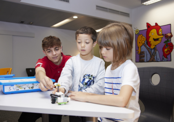 Edwin Pasic hilft den Kids beim Bauen und Programmieren eines kleinen Roboters. © A1/APA Fotoservice Ben Leitner