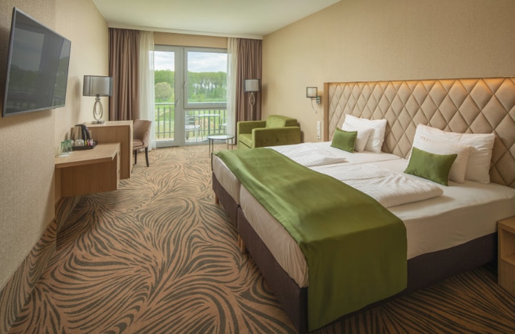 Auch im Wellnessbereich "Spa Essence", mit Outdoor-Pool, Becken mit Massagedüsen, Jacuzzi und Sprudelbad, ist Entspannung angesagt. Oder in der Saunawelt mit zehn Saunaattraktionen, darunter eine Panoramasauna mit Blick auf den Balaton. Gespeist wird auf der Terrasse, selbstverständlich mit Seeblick oder französisch im á la carte Fine-Bistro. Die Zimmer sind modernst ausgestattet, zur Auswahl stehen Doppel- und Familienzimmer sowie Suiten mit privaten Terrassen für lauschige Abende.