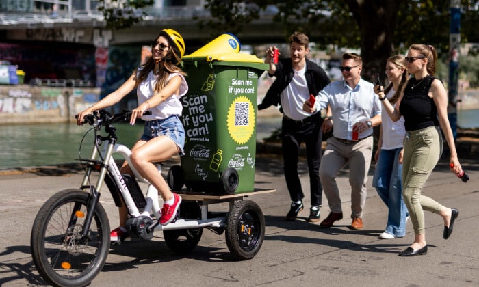 Ziel: Um Bewusstsein für die korrekte Abfalltrennung im "zweiten Wohnzimmer" der Wiener:innen zu schärfen, schicken die beiden Partner jeweils freitags und samstags eine fahrende Edition der Gelben Tonne auf den Weg. Wer sie bei ihren Touren am Donaukanal entdeckt, kann gleich doppelt gewinnen: Über den Scan des aufgedruckten QR-Codes erhalten User:innen der App Digi-Cycle 1+1 Gratis Coca-Cola Konsumationsgutscheine als Sofortpreis bei teilnehmenden Partnerbetrieben.