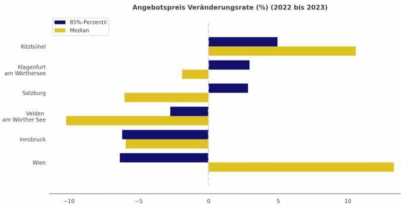 PriceHubble zufolge seien die Angebotspreise im mittleren und unteren Preissegment im Vergleich zu 2022 in fast allen Standorten um 1,9 bis 10,2 Prozent gesunken. Einzige Ausnahmen würden Wien, wo in diesem Segment die Preise um 13.8 Prozent und Kitzbühel, wo sie um 10,6 Prozent gestiegen sind, bilden. Weiters zeigt die Studie, dass sich im oberen Segment die Preise je nach Standort unterschiedlich entwickelt haben. So seien sie in Salzburg um 2,8 Prozent, in Klagenfurt um 2,9 und in Kitzbühel um knapp fünf Prozent gestiegen. Im Gegensatz dazu seien sie in Velden um 2,7 Prozent, Innsbruck um 6,2 Prozent und Wien um 6,3 Prozent gesunken.