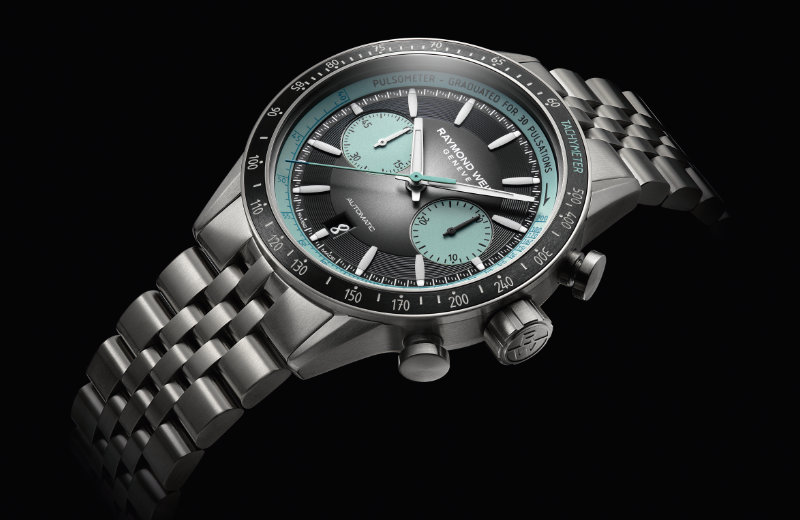 Ein bemerkenswertes Design mit türkisfarbenen Akzenten auf dem Zifferblatt, der Lünette und der Schwungmasse, flößt der Chronographenreihe Freelancer eine mitreißende kreative Energie ein. Das 43,5-Millimeter-Titangehäuse mit Tachymeter-Lünette aus schwarzer Keramik bietet alle Elemente eines Raymond-Weil-Chronographen: das Automatikwerk RW5030, eine Gangreserve von 56 Stunden sowie eine verschraubte und kannelierte Krone mit RW-Monogramm.