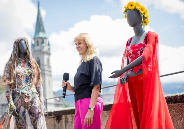 Bettina Hering (Leitung Schauspiel) mit den Kostümen von Göttin und Buhlschaft © SF / Leo / Neumayr