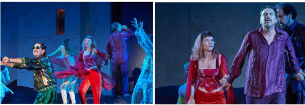 Szenenfotos aus Jedermann: Fridolin Sandmeyer (Dünner Vetter), Michael Maertens (Jedermann) und Valerie Pachner (Buhlschaft) links; Valerie Pachner, Michael Maertens und Helmfried von Lüttichau (Jedermanns guter Gesell) rechts © SF / Matthias Horn