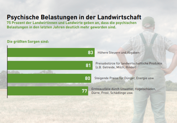 Die Ergebnisse bringen einiges zum Vorschein. Acht von zehn Landwirt:innen sagen, dass Ernteausfälle aufgrund von Wetterextremen ihnen Sorgen bereiten. Drei Viertel der Befragten geben an, dass die psychischen Anforderungen und Herausforderungen in den letzten Jahren generell mehr geworden sind.