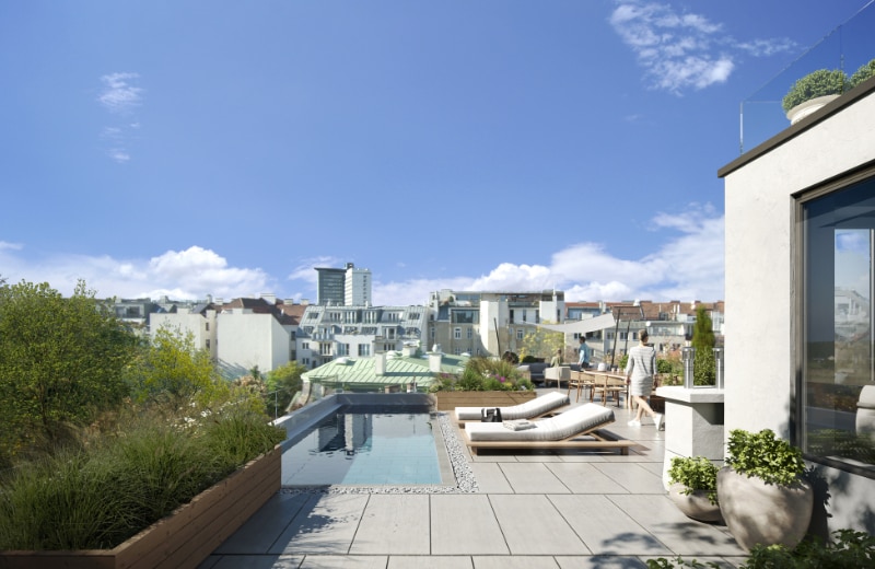 "Ein Highlight ist mit Sicherheit der auf der großzügigen Dachterrasse des Penthouses errichtete Pool, der das Baden unter freiem Wiener Himmel mit unglaublichem Stadtblick ermöglicht", sagt Michael Schmidt, Geschäftsführer der 3SI Immogroup und fügt hinzu: "Mich persönlich freut allerdings besonders die Umrüstung des kompletten Hauses von Gas auf Fernwärme. Rund 470.000 Gasthermen existieren aktuell allein in Wien. Jedes einzelne Objekt, in dem uns der Wechsel des Heizsystems auf die grünere Alternative der Fernwärme gelingt, ist für mich ein absoluter Gewinn", so der Bauträger.