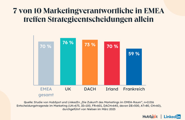 Im EMEA-Raum entscheiden sieben von zehn Marketingverantwortlichen allein von zehn Marketeers Entschlüsse über Marketingservices und -strategien ihres Unternehmens allein. Das zeigt die Studie "Die Zukunft des Marketings im EMEA-Raum", die Nielsen im Auftrag von HubSpot und LinkedIn durchgeführt hat. Dafür wurden insgesamt 2.016 Entscheidungstragende im Marketing zu ihren Herausforderungen und Prioritäten befragt, 640 davon aus dem DACH-Raum. Hier liegt der Anteil der Alleinentscheider:innen sogar bei 73 Prozent.